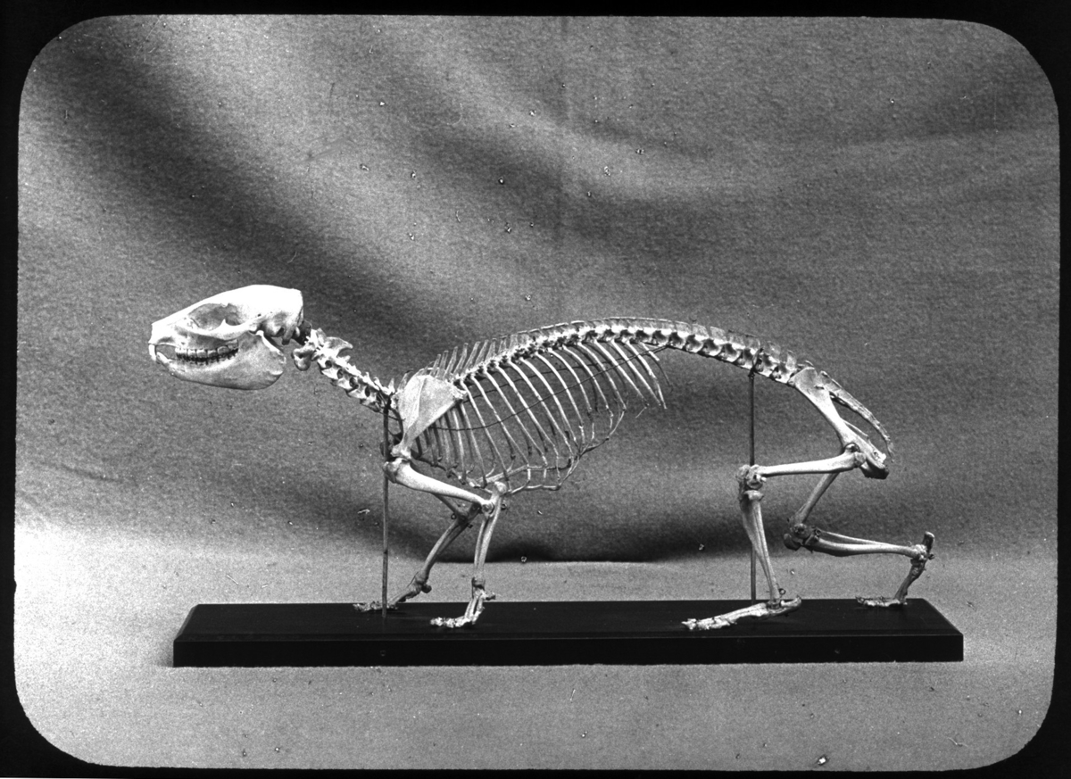'Skelett av klippgrävling, sett från sidan. :: :: Från Dr. Schlüter & Mass, Halle a S naturvetens. Läromedel. Numrerade Serie I.A. Nr 1-30. :: :: Ingår i serie med fotonr. 5374:1-30. Se även hela fotoserien 5374-5376.'