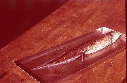 'Bilder en död lungfisk från akvariet. Avgjuten och placerad i basutställningen på Göteborgs Naturhistoriska museum, 1960. Avgjutningen gjord av Björn Wennerberg. :: :: Fotograferad på en bricka på ett bord.'