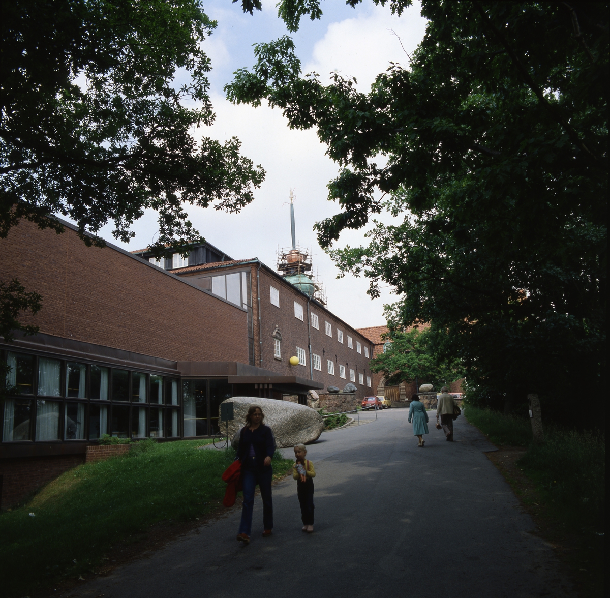 'Göteborgs Naturhistoriska museum sett mot entrén och parkeringen. Byggnadsställning på spiran. 1 kvinna och 1 barn gående i förgrunden. Längre bak 1 kvinna och 1 man. Bilar. Solen i ''Rymdpromenaden''.'