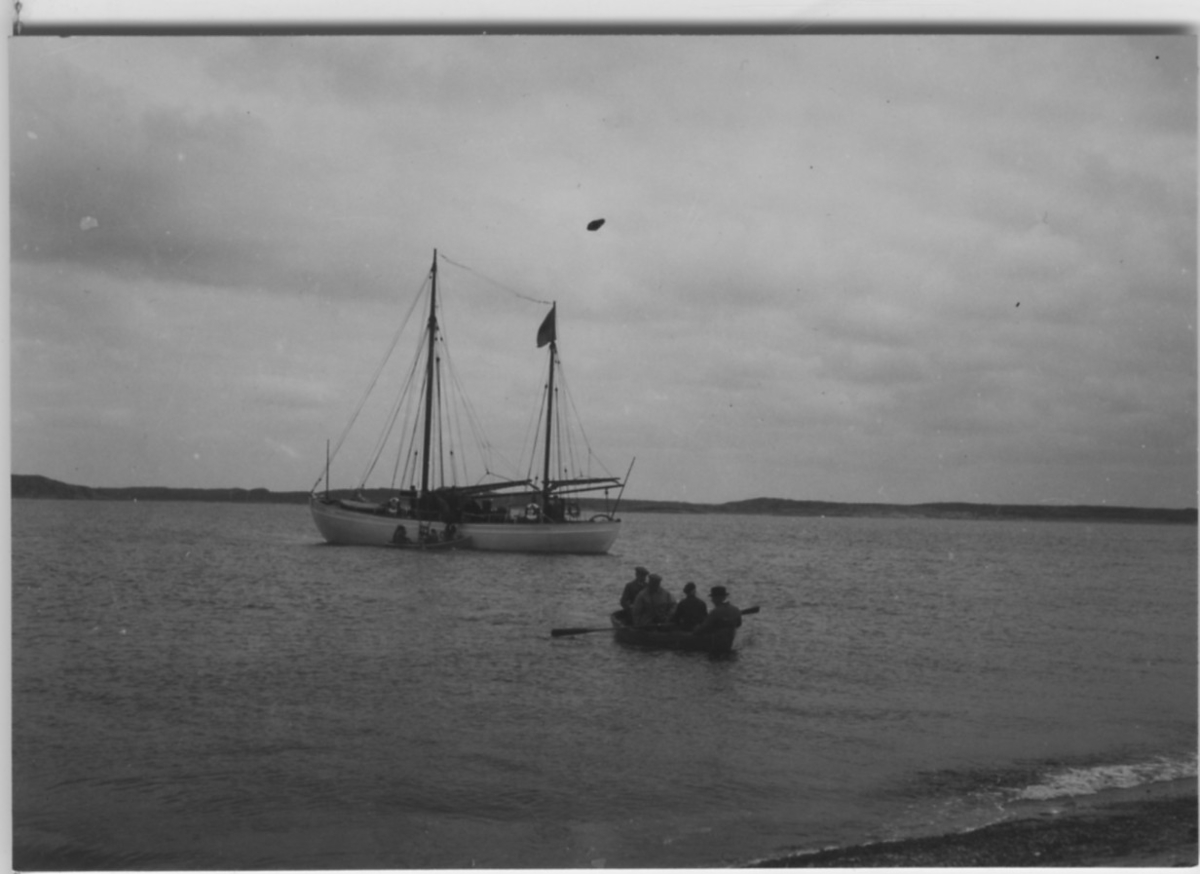 'Biologiska förenings utfärd till Fjärås-Onsala-Nidingen-Malön-Kalvön: :: :: ''Landning på Malön'', 4 st män på väg i roddbåt från båten ''Wilh.R.Lundgren''. Vy med eka. :: :: Se fotonr. 2489-2500 och 2501-2515 från samma utfärd.'