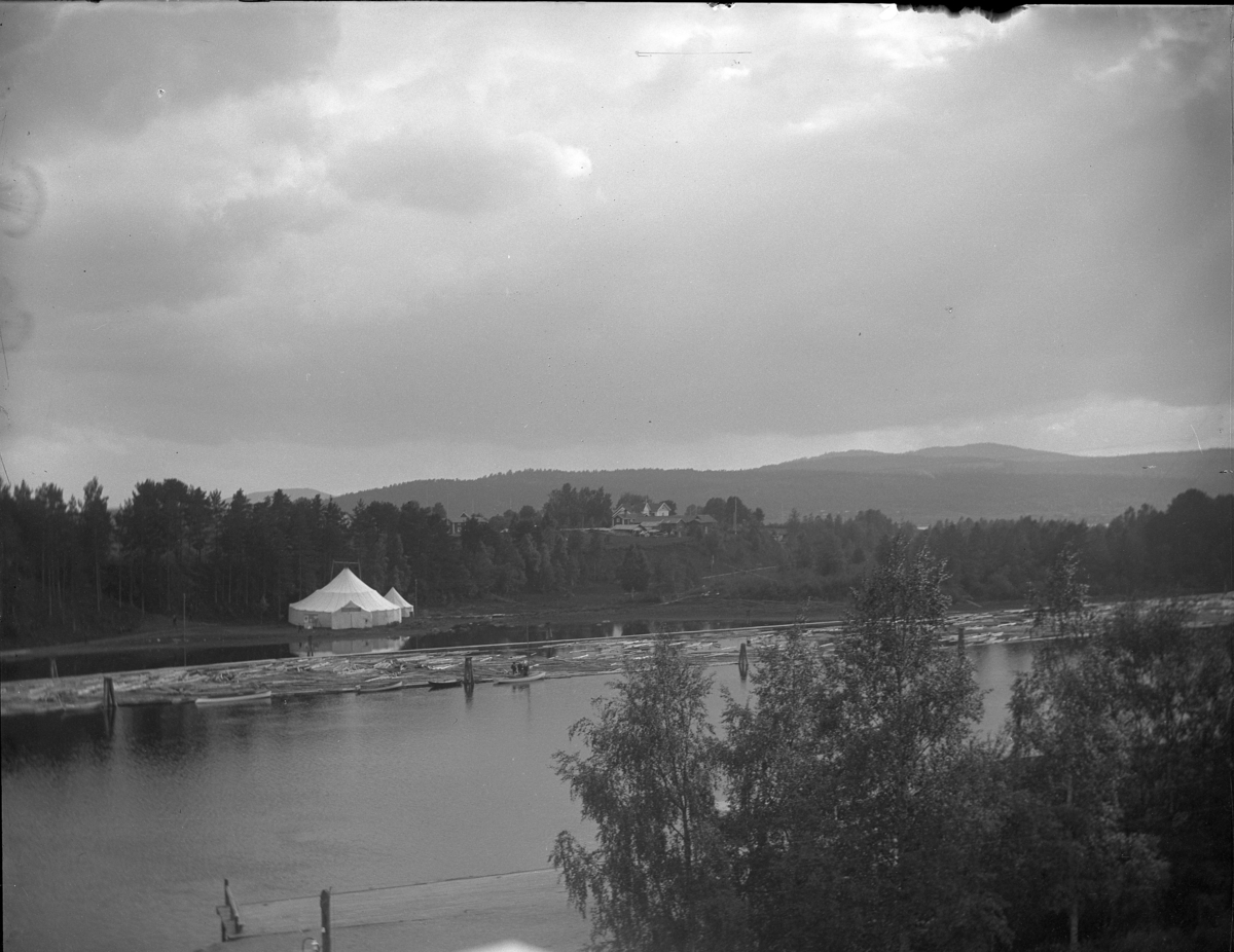 'Bildtext: ''Åkerolandet.''? (Kan vara Åkerölandet). :: Vy över vattendrag, på andra sidan stort tältbyggnad och hus. I vattnet timmerstockar. :: :: Ingår i serie med fotonr. 5231:1-11. Se även fotonr. 5223:1-13, 5232:1-8 och 5234:1-12.'