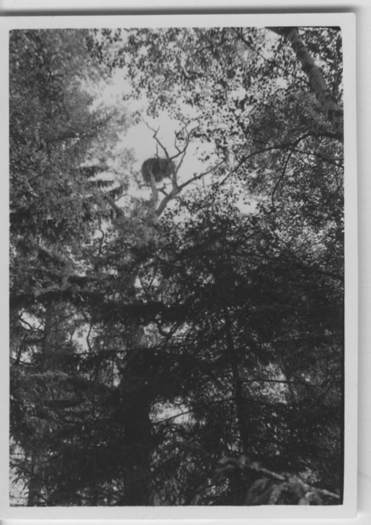 'Biologiska föreningens utfärd till Läckö och Stora Ekens skärgård: :: :: Fiskgjusboet i tall på Stora Eken sett underifrån. Vy ypp mot trädkronor av lövträd och granar. :: :: Se fotonr. 3242-3254, 3255, 3256-3259, 3260-3285 samt 3889-3894.'