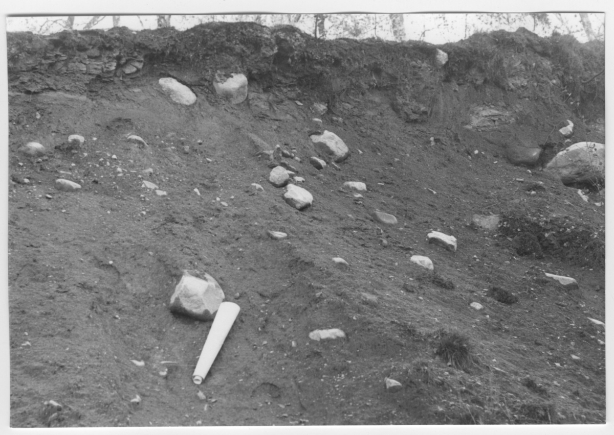 'Bildtext: ''Skärning. Sand och morängrus.'' :: :: Ingår i serie med fotonr. 6970:1-1125, dokumentation av Hisingens naturgeografi, visande landskapsformerna i stora drag och gjord inför exploateringen av området. Platserna för fotograferingen finns utsatta på karta i skala 1:4000 som finns på Göteborgs Naturhistoriska musem. Fotoriktningen mättes med kompass i gammalgrader.'