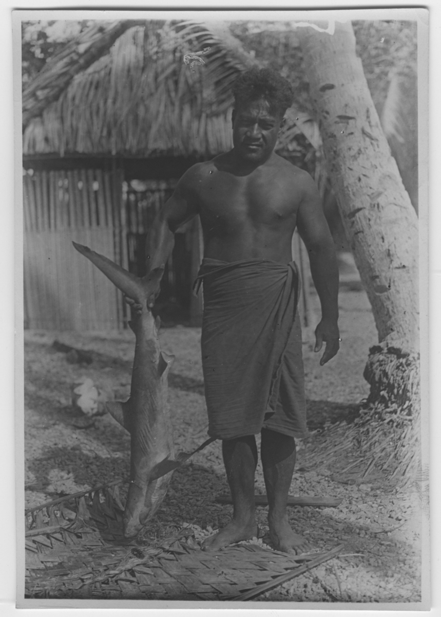 'Bock och Hessle: expeditionen till Gilbertöarna: :: :: i man iklädd höftbeklädnad, stående framför hus, hydda med haj i ena handen. Text på baksidan: ''Min kock och tolk medtagen från Tarawa''. :: :: Ingår i serie med fotonr. 6977:1-15.'
