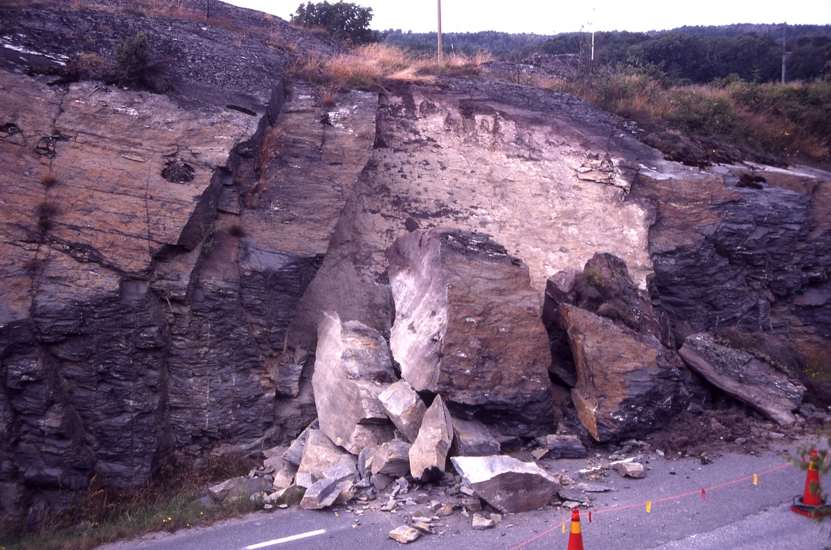 'Fagerfjäll, bergras: :: Närbild på rasade berget, avspärrningskoner utsatta på vägen nedanför. :: :: Ingår i serie med fotonr. 7019:1-12 med bilder från bergras i Fagerfjäll.'