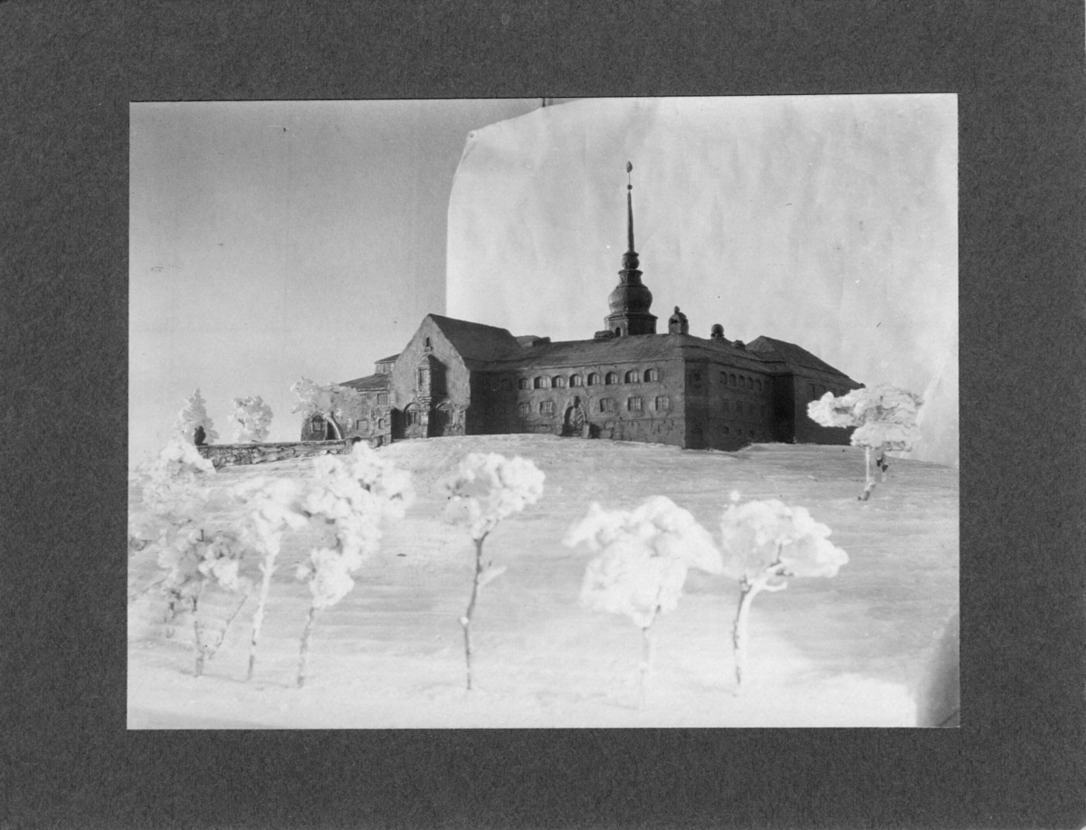 'Modell av Naturhistoriska Museet. Slottsskogen. Fotograferad från olika vinklar. Här snett framifrån från höger. :: :: Bilden stämplad: :: ''Stadsfullmäktige i Göteborg'' :: :: Se fotonr. 912, 927, 1068:1-2 och 6968:1. :: :: Se även artikel ''Naturhistoriska museet i Slottsskogen'' i Göteborgs Tidningen 1916-12-15 och ''Grunden lagd till Göteborgs naturhistoriska museum'' Dagens Nyheter 1916-12-18. Dossier s.64.'