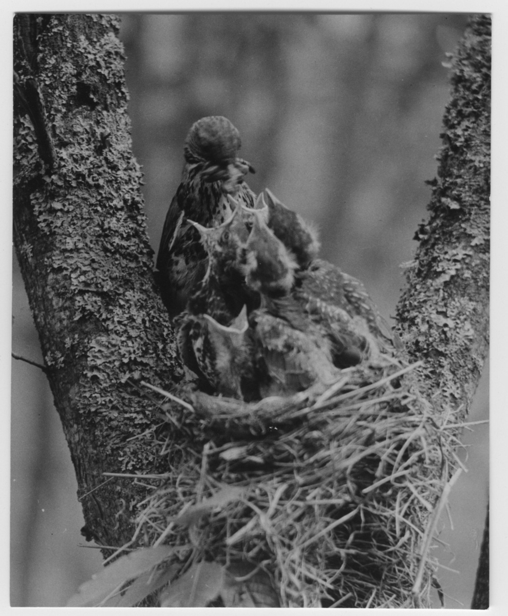 'Björktrast (Snöskata) matar sina ungar. Boet i trädklyka, lavklädd trädstam. :: :: Ingår i serie med fotonr. 3550-3567. Se särskilt fotonr. 3562-3564.'