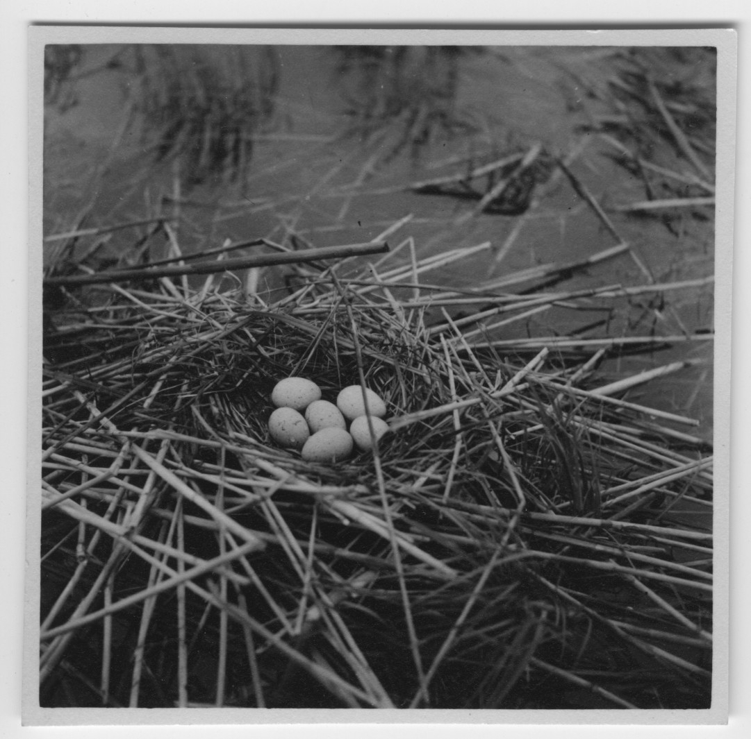 'Göteborgs Biologiska förenings utfärd till Tåkern: :: :: Bo av sothöna, med 6 ägg. Vassbo i sjön. :: :: Se fotonr. 3574-3577.'