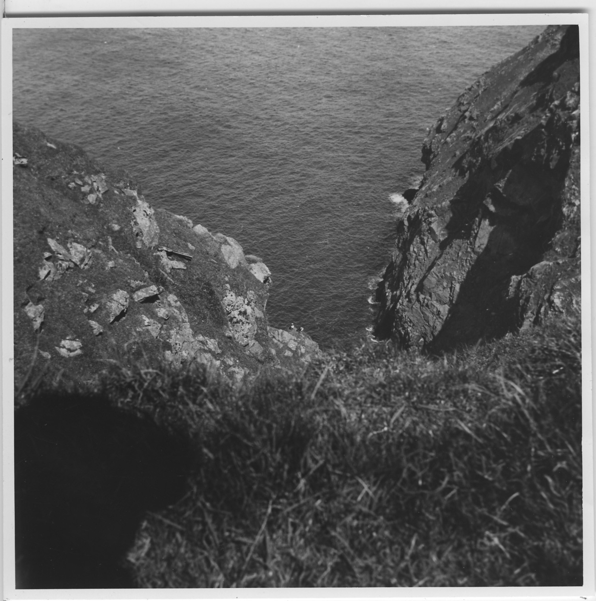 'Shetlandsexpeditionen: :: :: Klyfta med lunnefågel. Vy med klippor och hav. :: :: Ingår i serie med fotonr. 4114-4118.'