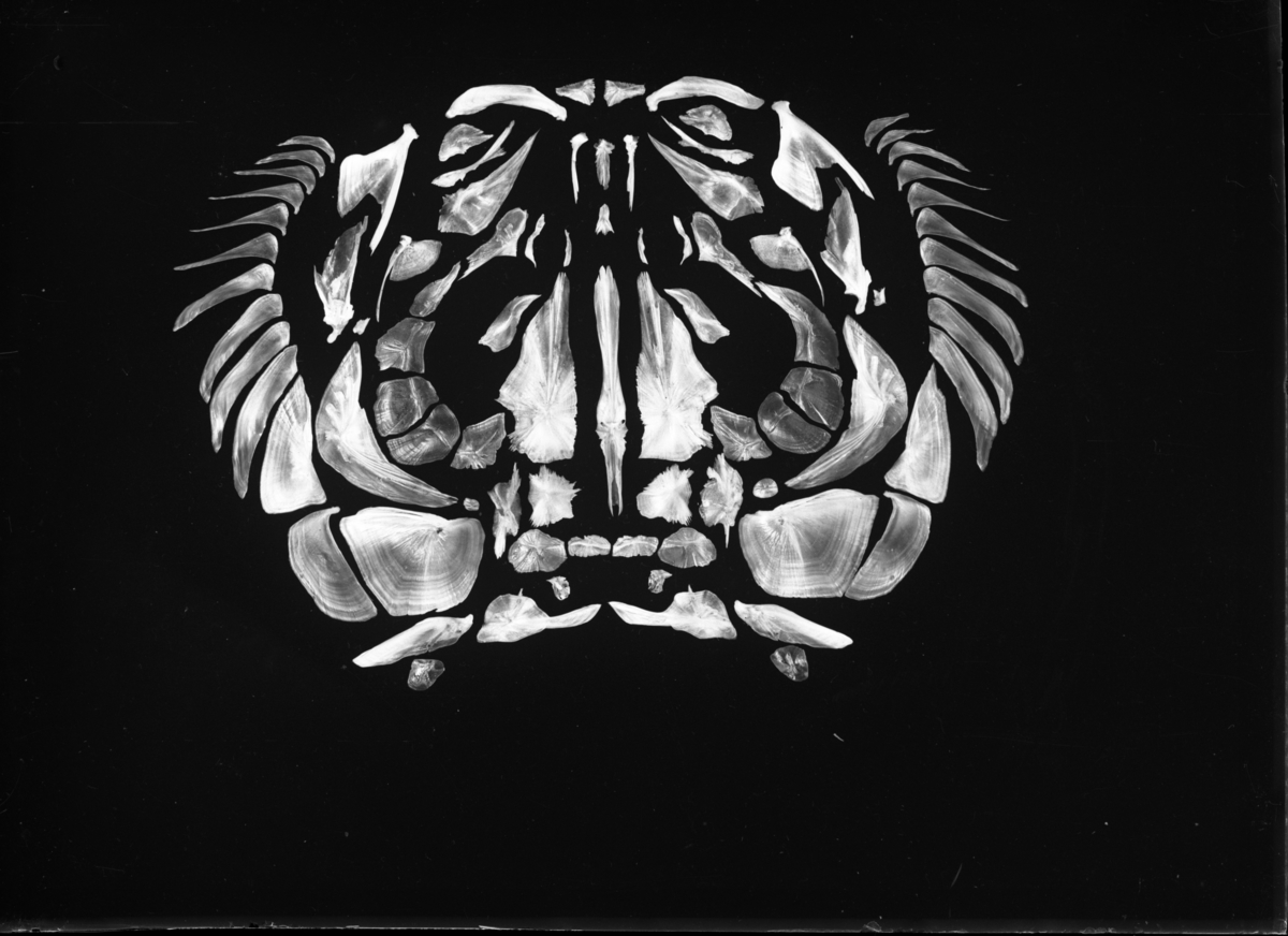 'Kranium av sik. Bilden publicerad. Bildtext: ''Fig. 21. Skallens täckben jämte skuldergördelns slemkanalsförande ben hos siken.'' :: :: Ingår i serie med fotonr. 5113:1-18. Se även fotonr. 7043:1-2.'