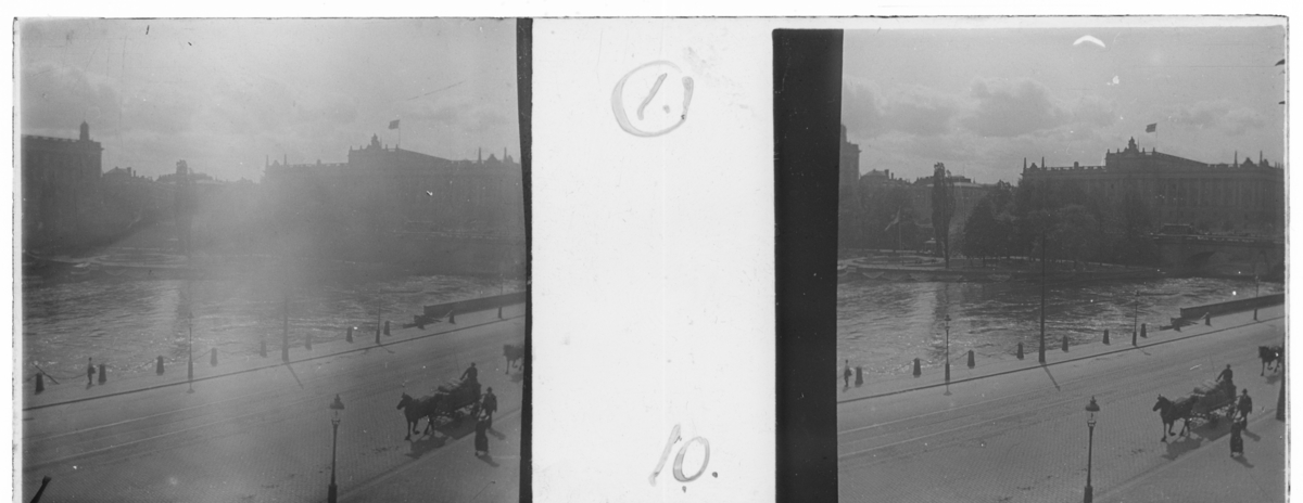 'Suddig vy av riksdagshuset. Hästdragna vagnar och gående människor i förgrunden. :: Enligt text till fotot: ''Riksdagshuset.'' :: :: Ingår i serie med fotonr. 5246:1-17, se även hela serien med fotonr. 5237-5267.'