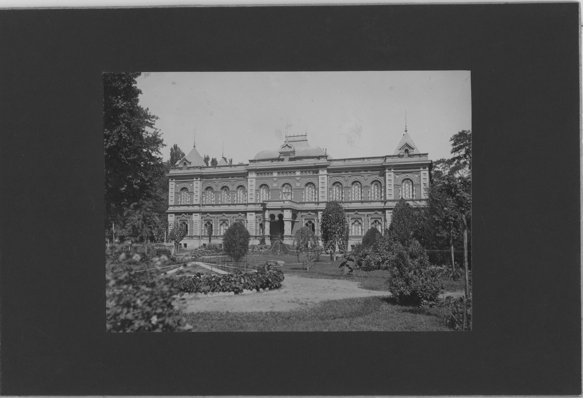 'Vy med stor byggnad med plantering, rabatter, trädgård framför. Detta motiv är samma plats som fotonr. 5272:4. :: :: Se serie med fotonr. 5272:1-18. Serie fotonr 5269-5292, Stuxbergs resa till Kaukasien, 1897.'