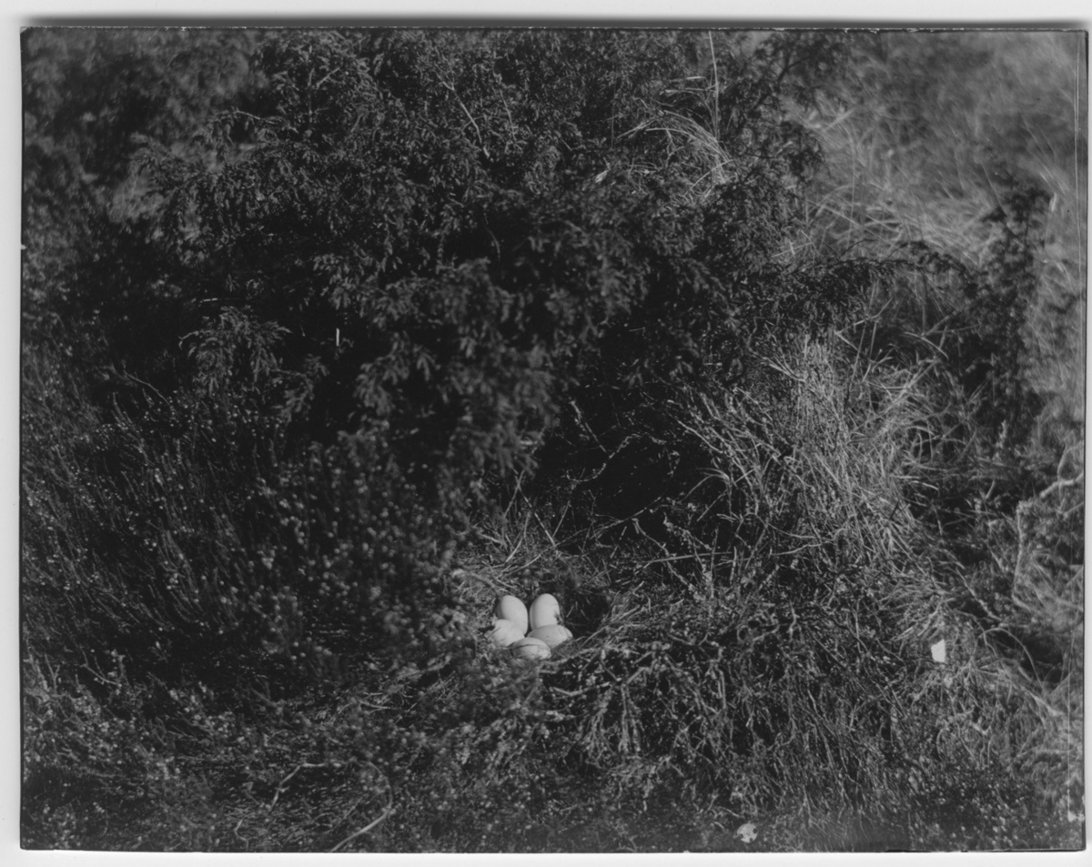 'Bläsand, bo med 5 ägg invid ev. enbuske och ljungvegetation. :: :: Ingår i serie med fotonr. 817-841.'