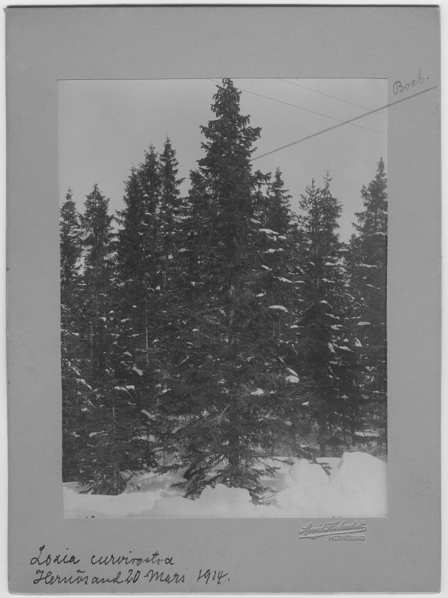 'Mindre korsnäbb, boplats i gran. Vy med granskog. :: :: Enligt bildtext: (8 m och 52 cm till trädets fot. 1 m och 52 cm kamerans höjd från marken.) Hela trädet avsågat 5 meter över marken. :: :: Fynddatum: 1914-03-20.'