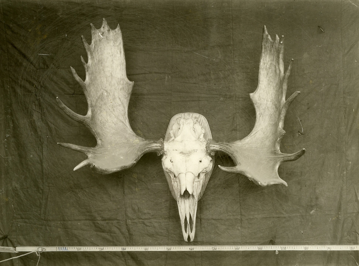 'Kranium av älg med horn med 24 spetsar. Älgkrona m. 12 spetsar å vardera hornet. :: :: Hänger i däggdjurssalen, ovanför monterskåp 64 och 65 på Göteborgs Naturhistoriska Museum. :: :: Bilden med i Göteborgs Naturhistoriska Museums Årstryck 1910 s.22.'