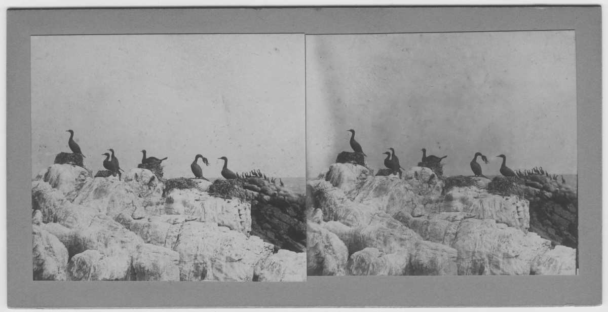'Skarvar vid bon, 6 fåglar i förgrunden och ett större antal i bakgrunden. På baksidan av fotot står: ''En annan skarvart - Ph. Neglectus - som bygga sina reden på strandklipporna. I bakgrunden till höger flyga ungar av en tredje art. Klippornas vita färg orsakas av fåglarnas exkrementer. :: :: Ingår i serie med fotonr.167-179, 181-184, 186-191, 193-196, 198-203 samt 205-215 med foton från Hilmer Skoogs expedition till Sydafrika år 1912-1913.'