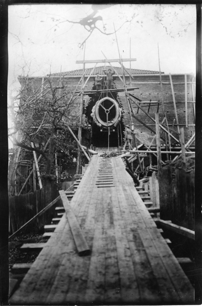'Zoologiska avdelningens flytt: :: Största valsegmentet in på museet, just före lyftningen över tröskeln. Malmska valen. :: :: Ingår i serie med fotonr. 743-754.'