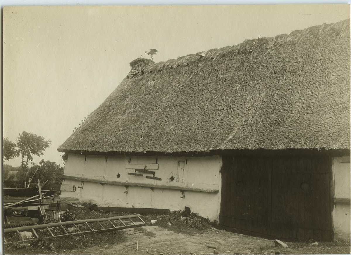 'Vit stork, bo på tak. Gårdsbyggnad med halm/vassklätt tak. På marken ligger bl.a. trästege. :: :: Se fotonr. 91-93.'