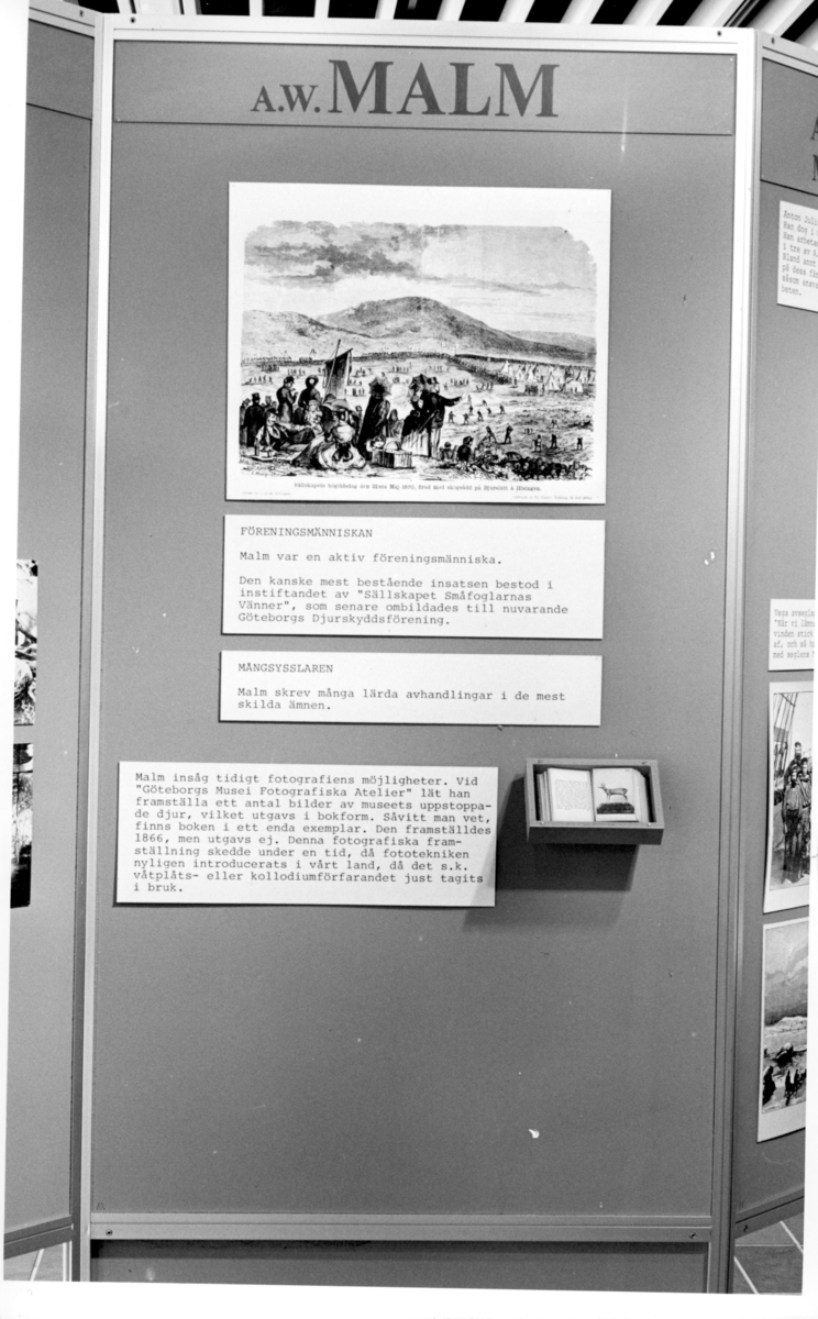 'Foto på Jubileumsutställningen, Göteborgs Naturhistoriska museum 150 år. :: :: Beskrivning av A.W. Malm som föreningsmänniska och mångsysslare samt det eda kända exemplaret som han lät framställa vid ''Göteborgs Musei Fotografiska Atelier''.'