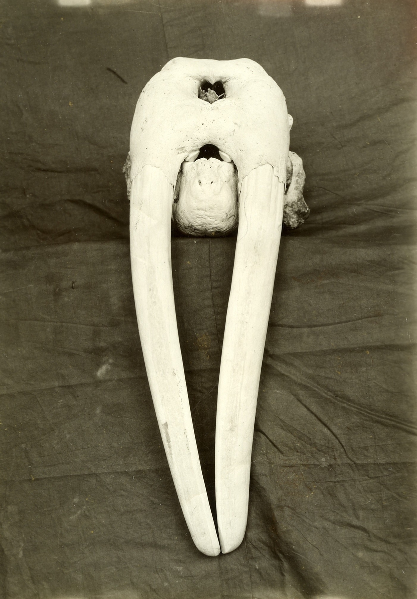 'Kranium av valross, gammal hane. Fynddatum: 1908-03-00. :: :: (Coll.an. 2.603-2.668 (kranier), 2.678, 2.679 (skelett), samt 2.682, 2.683) :: :: Bilden med i Göteborgs Naturhistoriska museums Årstryck 1910 s.24.'