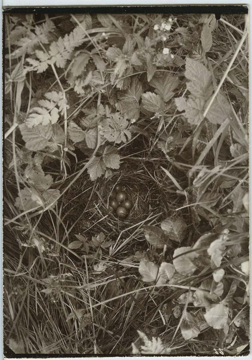 'Trädpiplärka, bo med 6 ägg. Bokträd och örtvegetation kring boet. :: :: Se även fotonr. 19.'