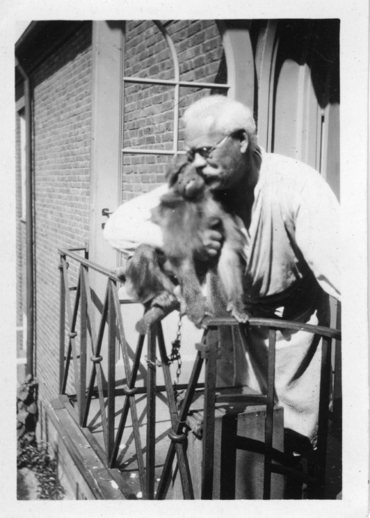 'Hilmer Skoog, kelar med Monjet (Moniet) på balkongräcket utanför ateljen. :: :: Med i Göteborgs Naturhistoriska Årstryck 2004. :: :: Se även fotonr. 951-952, 2575, 2973, 3375 och 3079. :: :: Monjet, ca 22 år gammal hona död 1938 (Gen.kat.nr. 1938-7467), levde på Göteborgs Naturhistoriska museum under större delen av sitt liv. finns i monter nr 37 i däggdjurssalen (25-05-2007) på Göteborgs Naturhistoriska museum. Monterad av David Sjölander.'