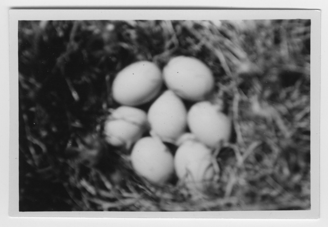 'Text enligt baksidan: ''Bo med 7 st nyvärpta ägg av gräsanden i gräset vid en stor sten. Då jag fotograferat det fiskmåsbo, som låg på andra sidan stenen och gick runt denna, flög honan upp ur sin rede. Tydligen är det ont om lokaler för bobyggande på denna mosse. Fotot är taget på 40 cm avstånd.'' :: :: Ingår i serie med fotonr. 4500:1-172.'