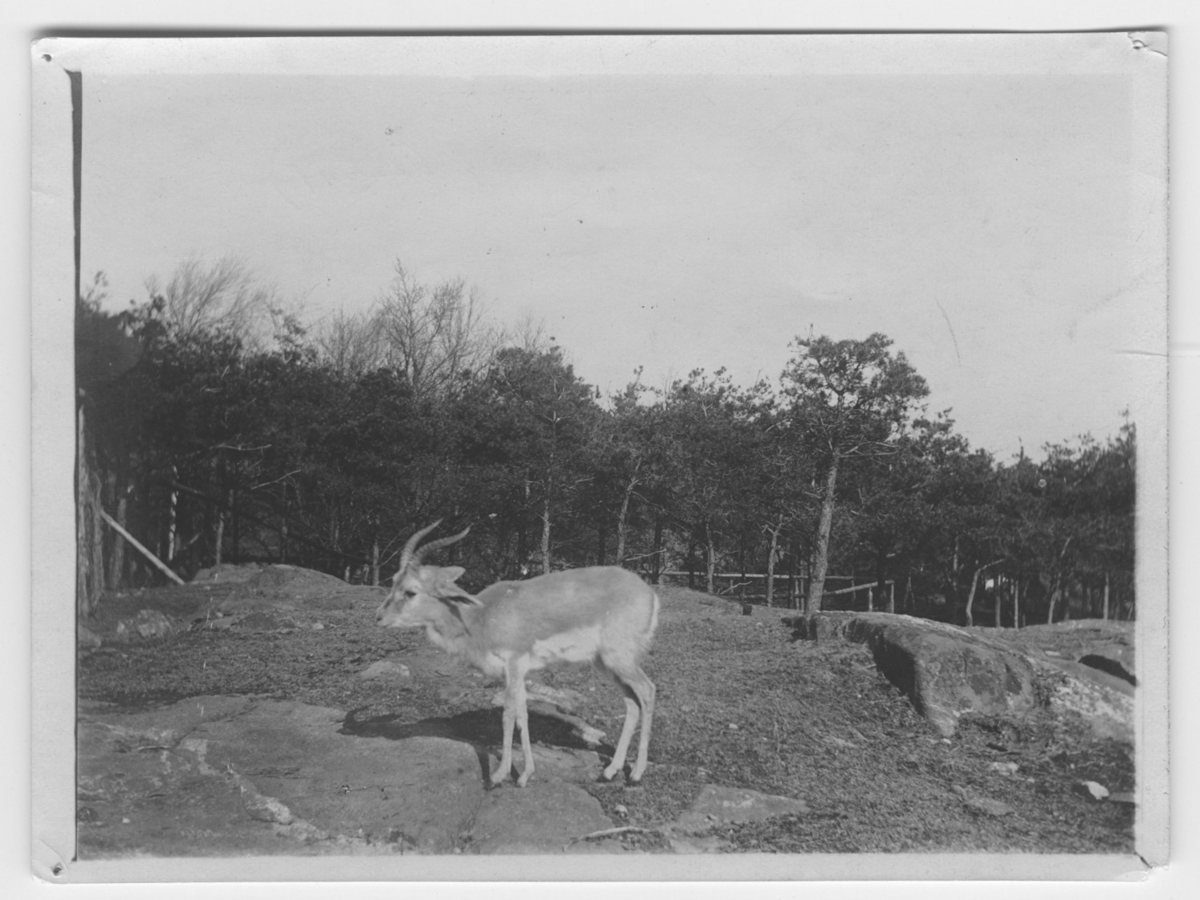 'Gasell i inhägnaden i Slottsskogen, sedd från sidan. Stående på berghällar, i bakrgunden staket och trädvegetation. Inkom datum: 1911-09-11. :: :: Coll.an.2847, 2873, 3067, 3077, 4633. :: :: Se även fotonr. 7036:7, samma motiv.'