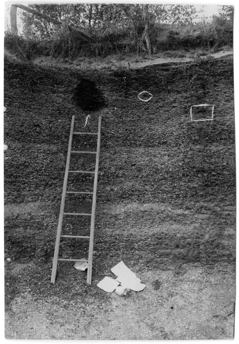 'Platsen för utgrävningen av ett revben av val. Pilen visar fyndplatsen för fynd 36 a. :: :: Se även fotonr. 1551.'
