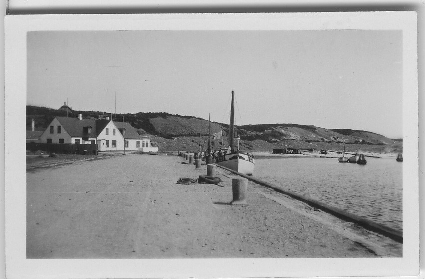 'Akkaexpedition, Bilder från Läsö och från båten (Skandia, FC51, FG51). :: :: Pir fotograferad på längden, från land, med båten FC 51 liggandes invid. I bakgrunden är hus, kullar, strand och ytterligare, mindre båtar, synliga i vattnet. :: :: Ingår i serie 5089:1-63. Se även fotonr 2401-2453.'