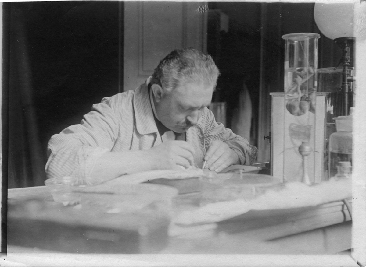 'Läroverksadjunkt Hjalmar Hagelin i konsevatorsateljen på gamla museet, Ostindiska huset. Lampa. :: :: Bilden med i Göteborgs Naturhistoriska Museums Årstryck 1937 s. 28 till minne av Hjalmar Hagelin (1869-12-30-1936-7-09)'