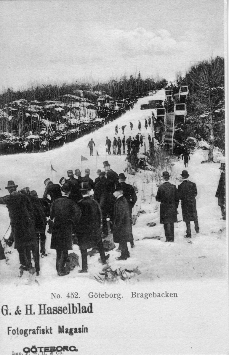 Bragebacken i snö med hopptornen och publik, sedd nerifrån och uppåt. Läktarna med träpåbyggnad.