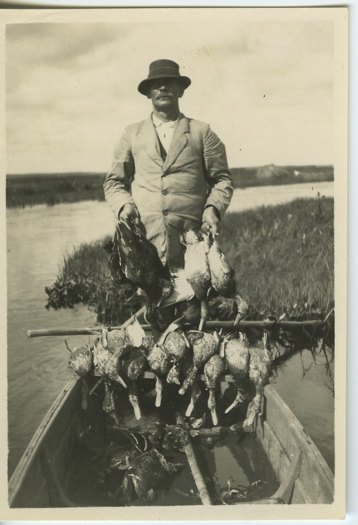 Tobi Tourunen i båt med fågelfångst i en eka. Vy över sjö i bakgrunden. Kläder. Klädsel.
