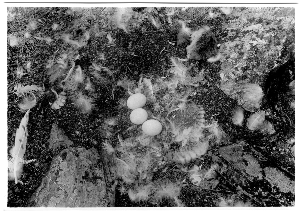 'Fjälluggla, bo med 3 ägg. :: :: Ingår i serie med fotonr. 1517-1529.'