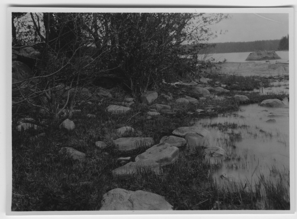'Storlom, häckplats i Mjörn, vy. Vattenbryn med stenblock i förgrunden. :: :: Se serie med fotonr. 1258-1304.'