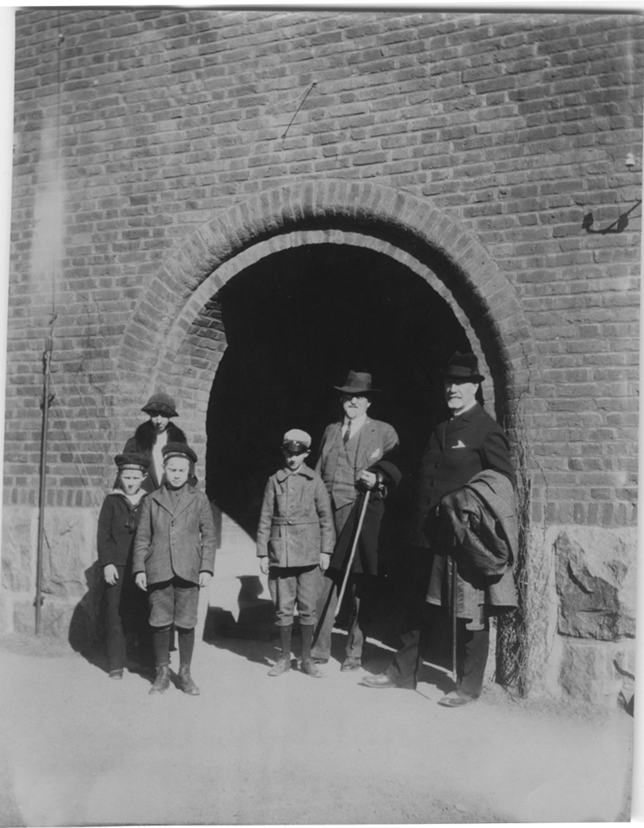 Professor Leonard Axel Jägerskiöld (andre från höger) , överste löjtnanten Hans Malmberg (längst till höger) samt 3 pojkar, barn och ev. 1 kvinna utanför östra porten.