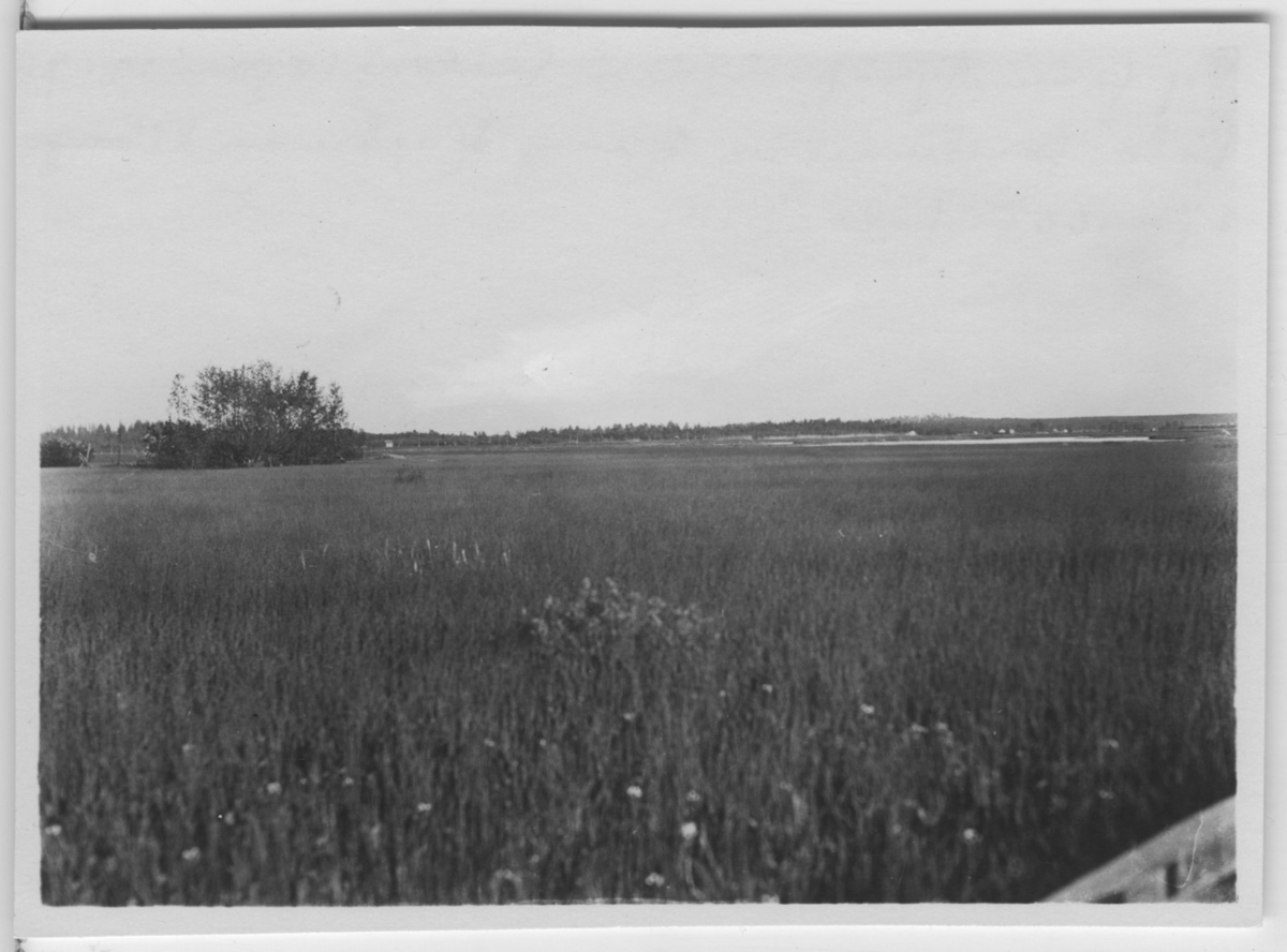 'Bildtext: ''Vy från Äyräpäänjärvi .'' :: Vy över öppet fält, ev. vassvegetation ner mot sjö. Träd- och buskdunge på avstånd. I fonden skog. :: :: Ingår i serie med fotonr. 1091-1108.'