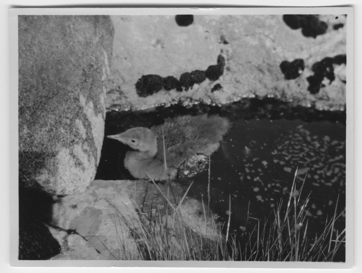 'Storlomunge simmande i vatten intill stenblock. Närbild. :: :: Se serie med fotonr. 1258-1304.'