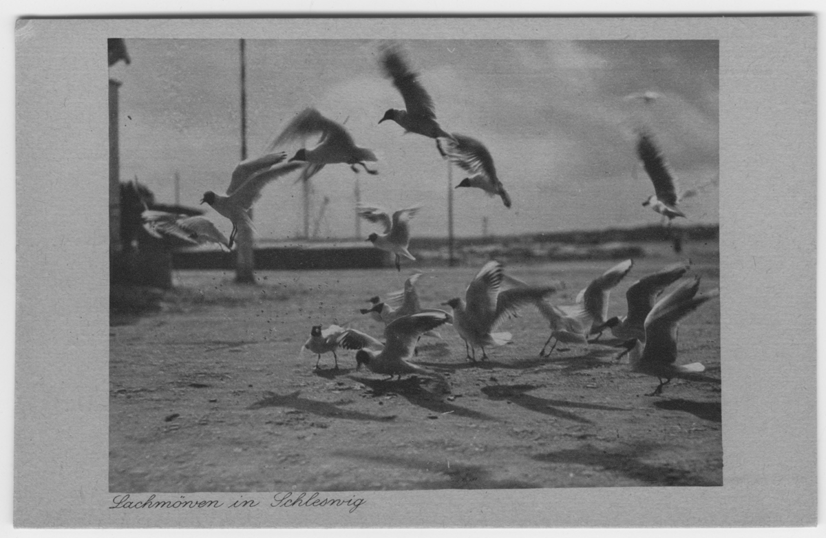 'Skrattmåsar, ca 15 st. Närbild. Tysk text på kortet. :: :: Ingår i serie med fotonr. 1201-1220.'