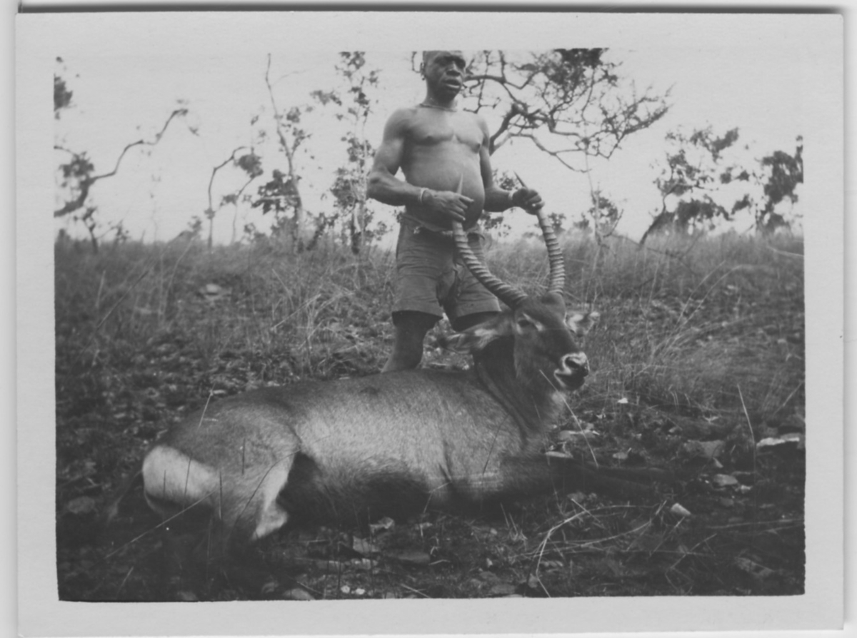 'Skjuten vattenbock liggande på marken, högt gräs och träd i bakgrunden. En man håller i hornen. Stäpp. :: :: Serie fotonr 1434-1449'