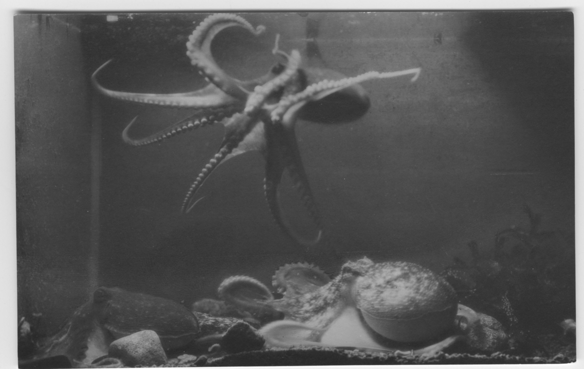 'Bläckfiskar. 1 bläckfisk på botten och 1 simmar. :: :: Ingår i serie med fotonr. 1083-1089.'