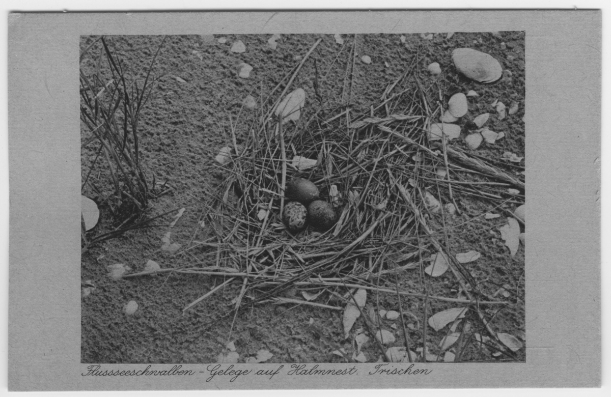 'Dvärgtärna, bo med 3 ägg i strandsanden. Tysk text på kortet. :: :: Ingår i serie med fotonr. 1201-1220.'