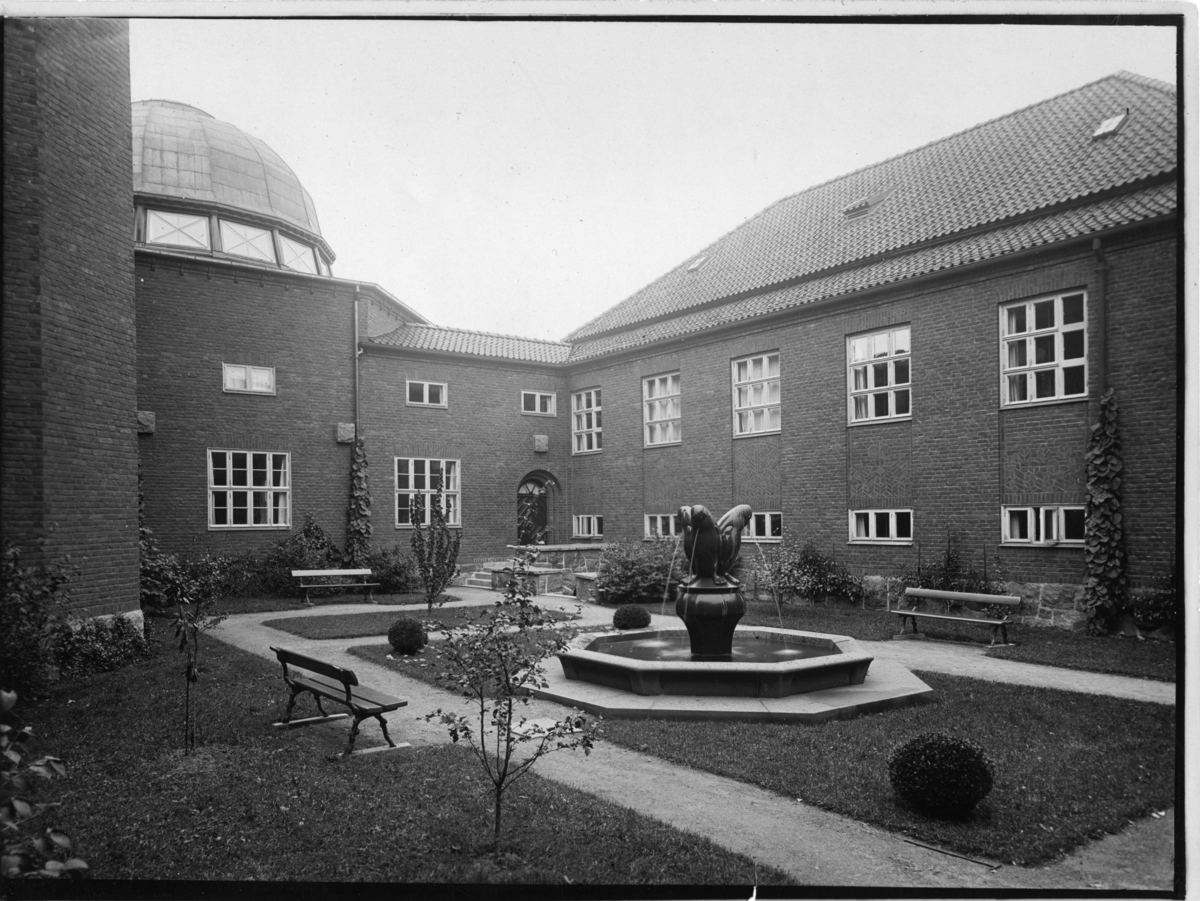 Parti från innergården med springbrunn och trädgård. Springbrunnen, fontänen med 3 st pingviner, i svart granit, gjord av Sigrid Fridman. Gården sedd snett mot dioramakupolen.