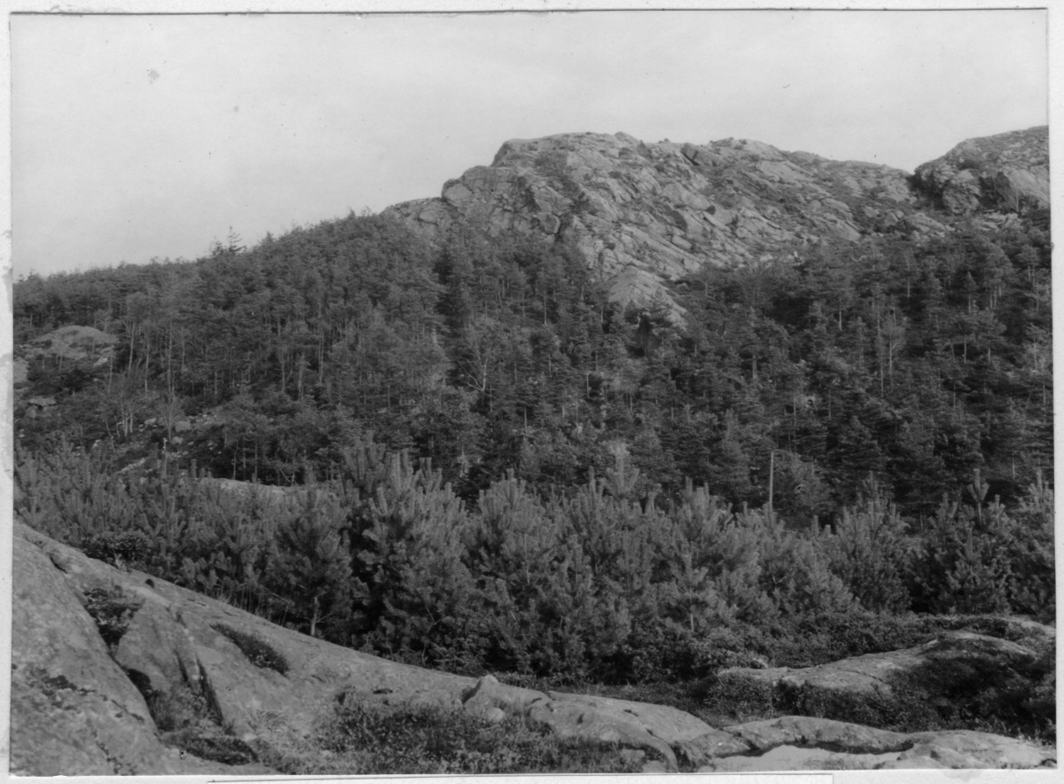 'Bildtext: ''Kulturskog på gammal ljungmark.'' Vy med barrträdsvegetation på berg. :: :: Fotonr. 7046:275-292 indelade som ''Kulturskogsbestånd i Göteborgs län och Bohus län''. Ingår i serie med fotonr. 7046:1-383, 7047:1-33 och 7048:1-67 med bilder från Länsjägmästare John Lindners bildarkiv.'
