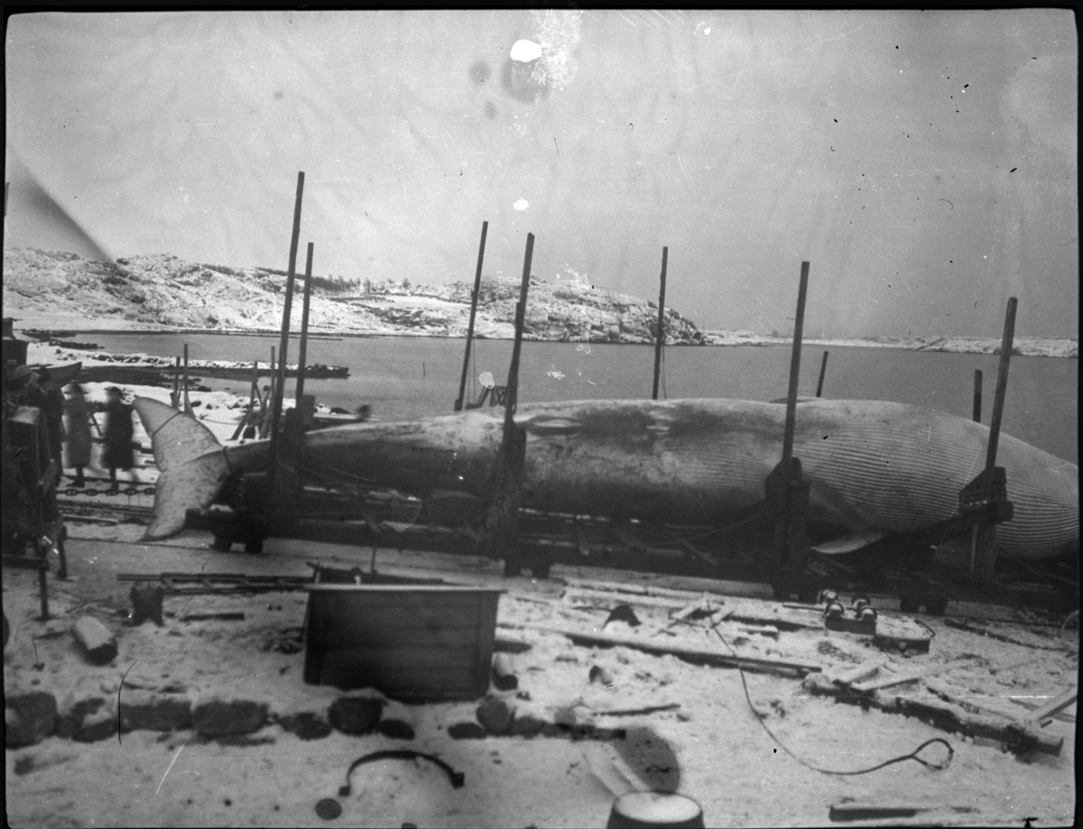 Sillval, hane, längd 14,90 m. Sillvalen liggande vid Grebbestads mekaniska verkstads slip. Sillvalen liggande på någon form av vagn. Grupp människor stående intill.