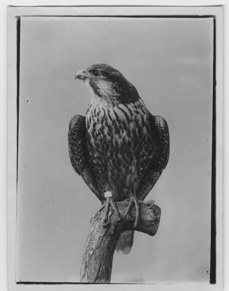 'Pilgrimsfalk, hona. Ringmärkt 923E Göteborg Sweden. Coll.an. 5382. Sedd framifrån, monterad på gren. :: :: Se fotonr. 1399-1401.'