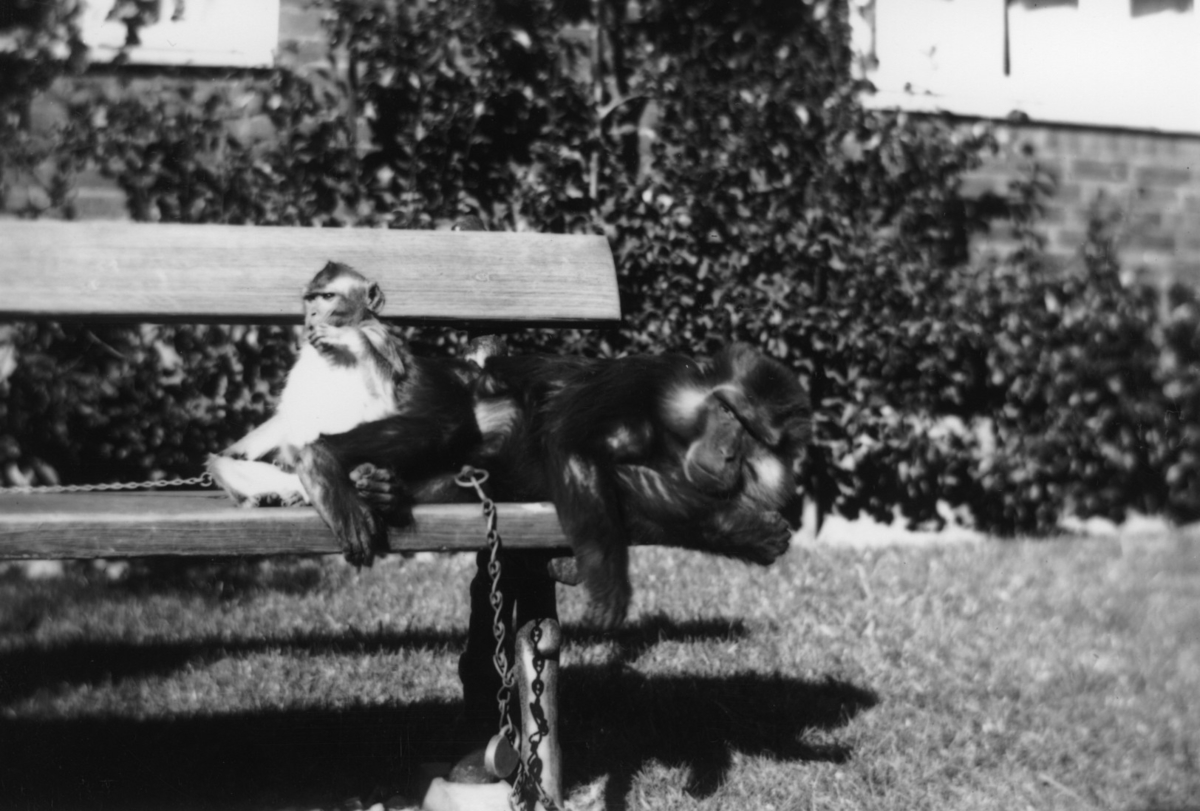 'De båda aporna som levde på Naturhistoriska museet sitter på träbänk på innergården. Apan till höger är en makak och hette Monjet, numera utställd i däggdjurssalen. :: :: (ev.till vykort) :: :: Bilden med i Göteborgs Naturhistoriska Årstryck 2000. :: :: Se även fotonr. 951-952, 2575, 2973, 3375 och 3079. :: :: Monjet, ca 22 år gammal hona död 1938 (Gen.kat.nr. 1938-7467), levde på Göteborgs Naturhistoriska museum under större delen av sitt liv. finns i monter nr 37 i däggdjurssalen (25-05-2007) på Göteborgs Naturhistoriska museum. Monterad av David Sjölander.'