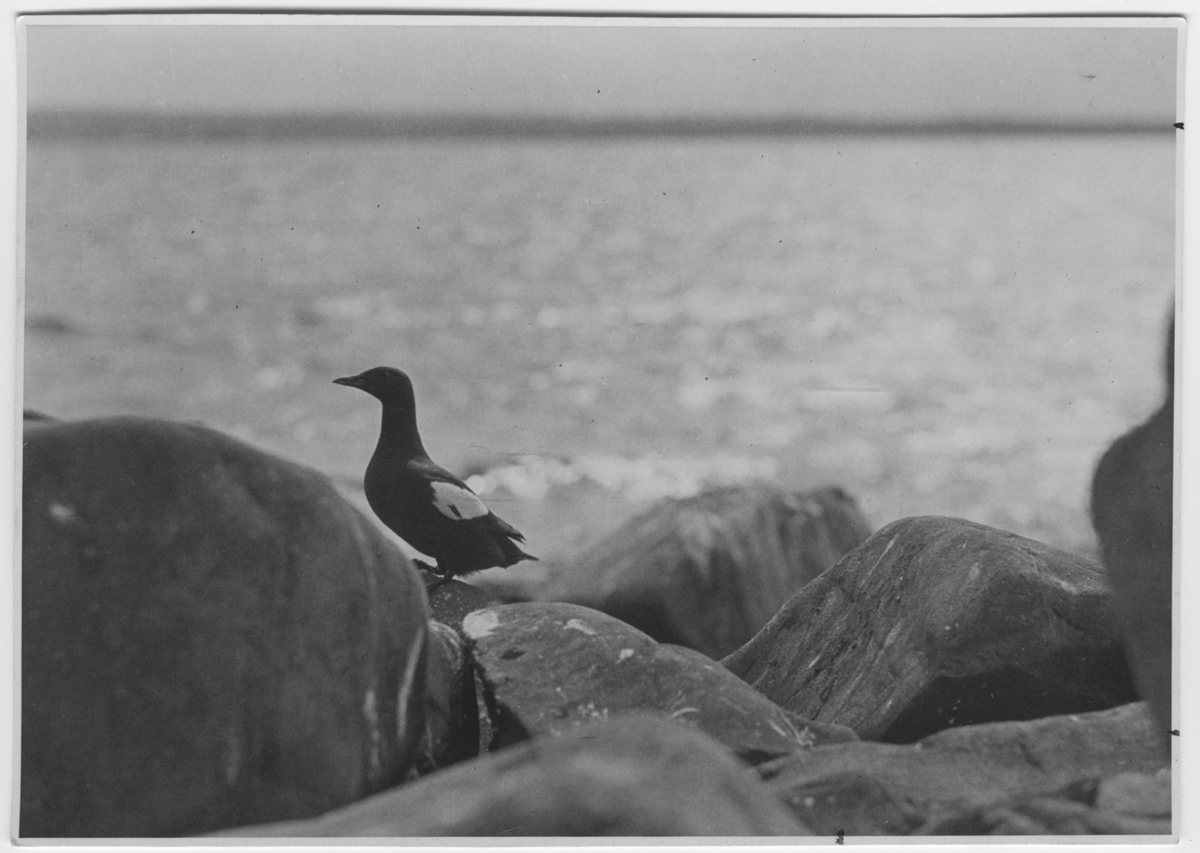 'Tobisgrissla vid ingången till boet, på klippor. Vy mot havet. :: :: Ingår i serie med fotonr. 2272-2304.'