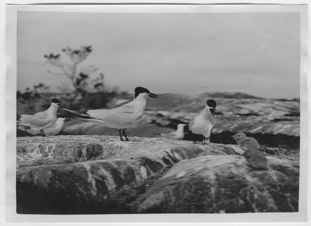 '5 st skräntärnor på bergshäll, även minst 2 st fågelungar. Närbild. :: :: Ingår i serie med fotonr. 2462-2487.'