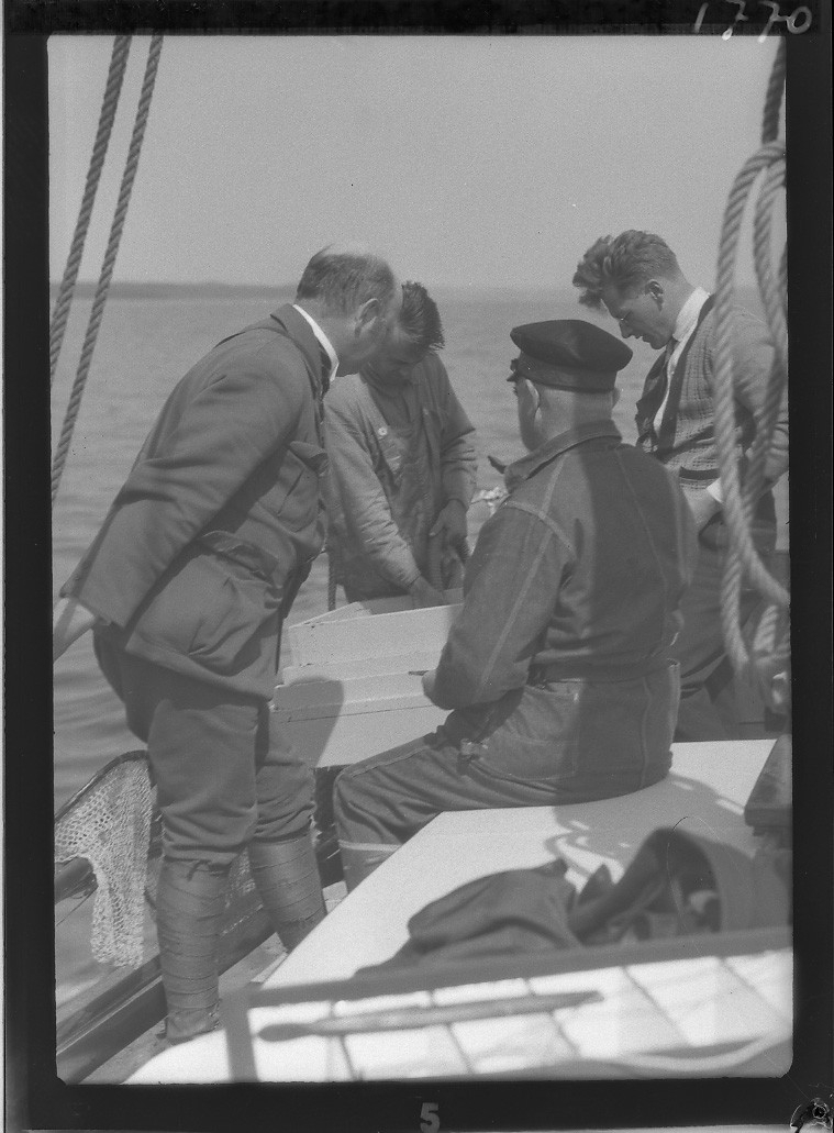 'Akka-exped maj 1929: :: :: Skrapningar med motorbåten ''Akka''. Professor Leonard Axel Jägerskiöld sittande samt 3 stående män, på däck. Ev. arbete vid såll. :: :: Ingår i serie med fotonr. 1770:1-4.'